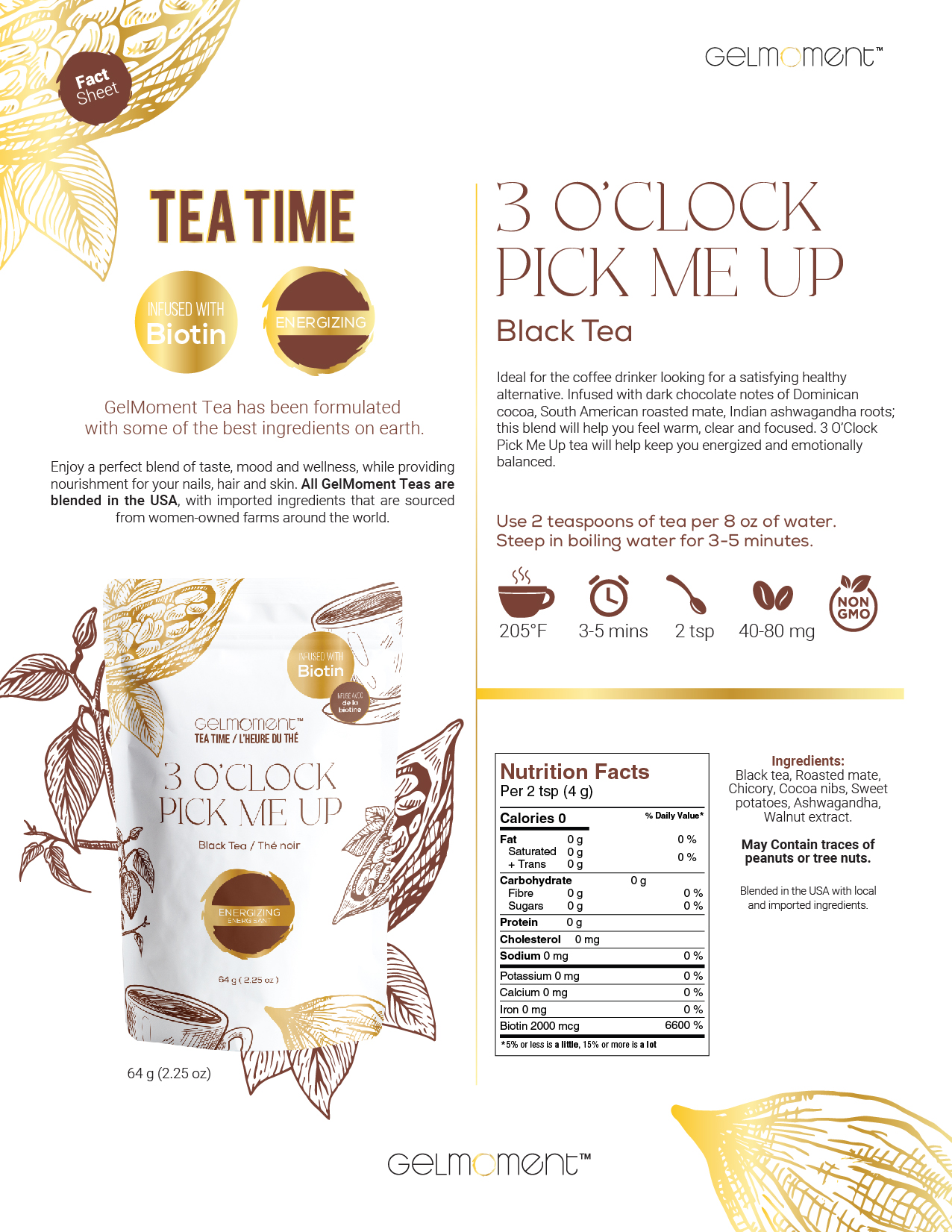 Black tea, roasted mate, chicory, cocoa nibs, sweet potatoes, ashwagandha, walnut extract.